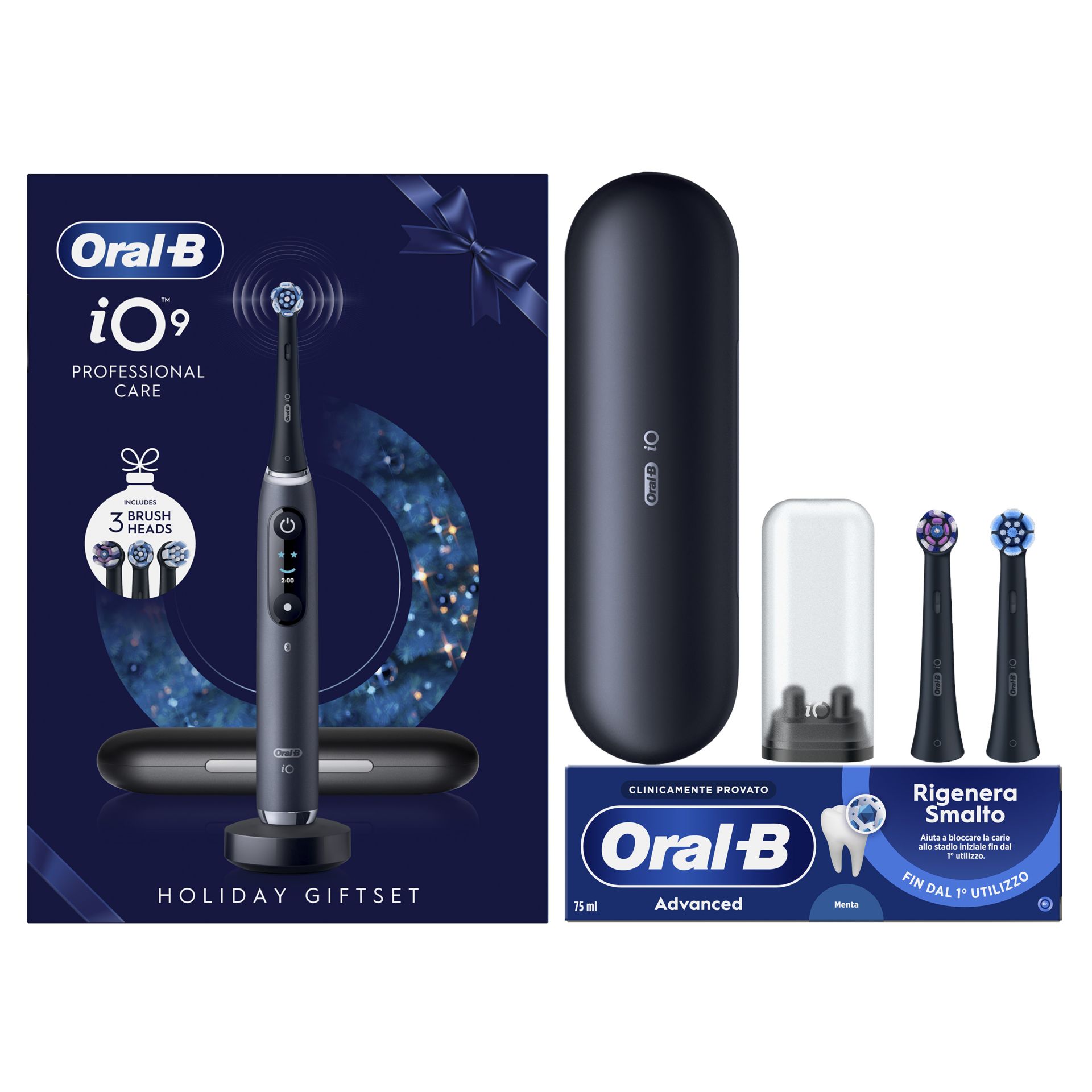 Oral-B Spazzolino Elettrico iO 9 Nero Giftpack Special Edition, 3 Testine, 1 Custodia Da Viaggio + Dentifricio Advanced Rigenera Smalto