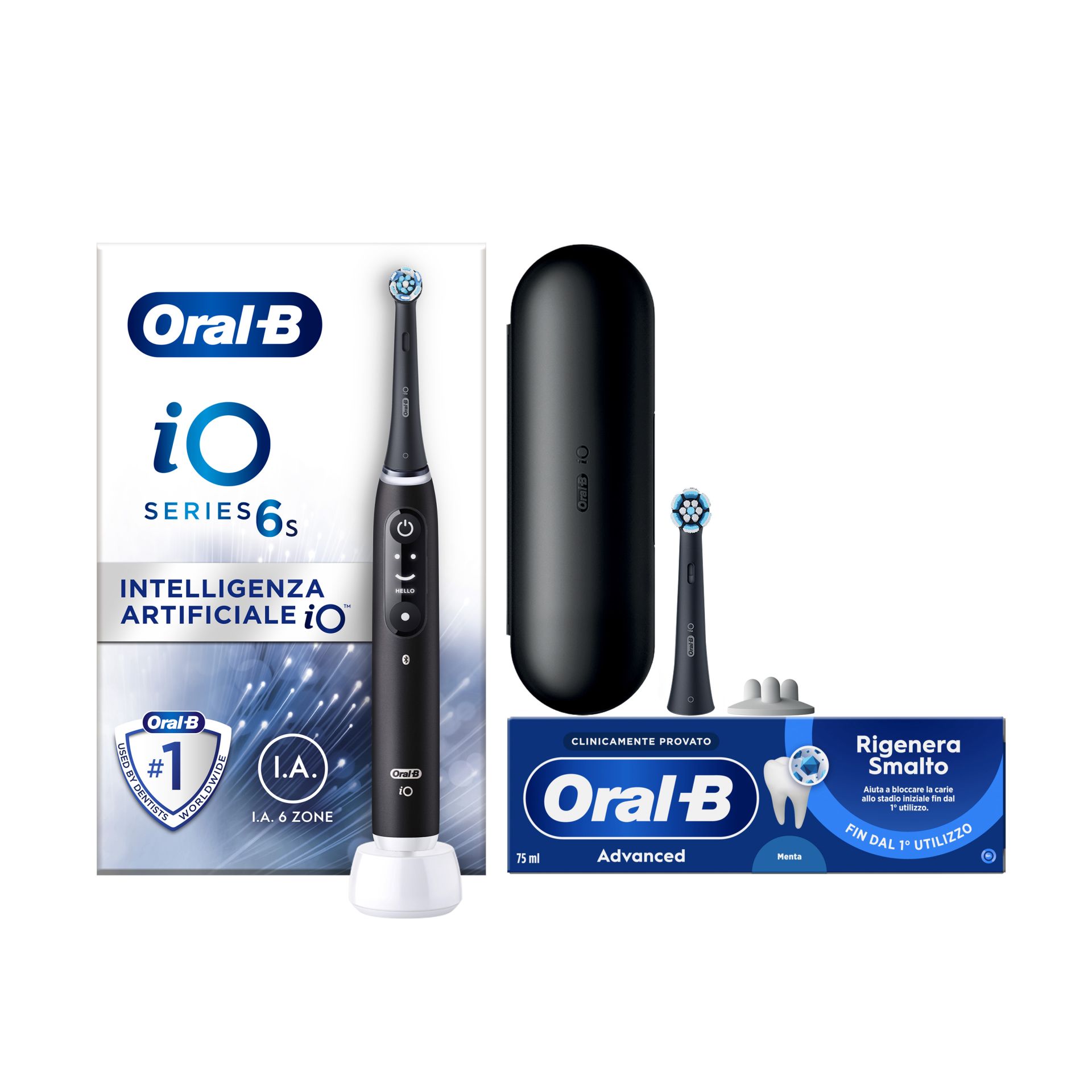 Oral-B Spazzolino Elettrico iO 6 Nero, 2 Testine, 1 Custodia Da Viaggio + Dentifricio Advanced Rigenera Smalto