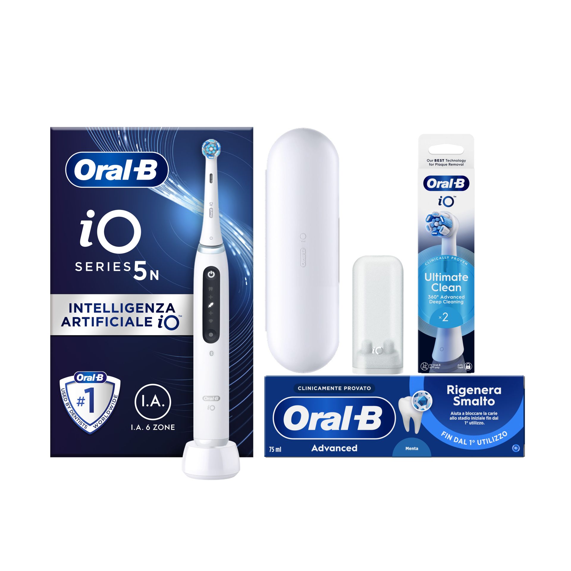 Lo spazzolino elettrico iO 5 presenta la migliore tecnologia Oral-B, combinando una testina rotonda ispirata agli strumenti dei dentisti con setole oscillanti per una sensazione di pulizia professionale ovunque tu vada. Il sensore di pressione intelligente ti aiuta ad evitare di spazzolare troppo forte o troppo delicatamente per proteggere meglio le tue gengive. Il riconoscimento dello spazzolamento con I.A. riconosce il tuo stile di spazzolamento guidandoti ogni giorno ad uno spazzolamento migliore. Si collega all’app Oral-B gratuita per monitorare e guidare in tempo reale lo spazzolamento in 6 zone. Sostituisci la testina dello spazzolino Oral-B iO ogni 3 mesi per risultati ottimali.