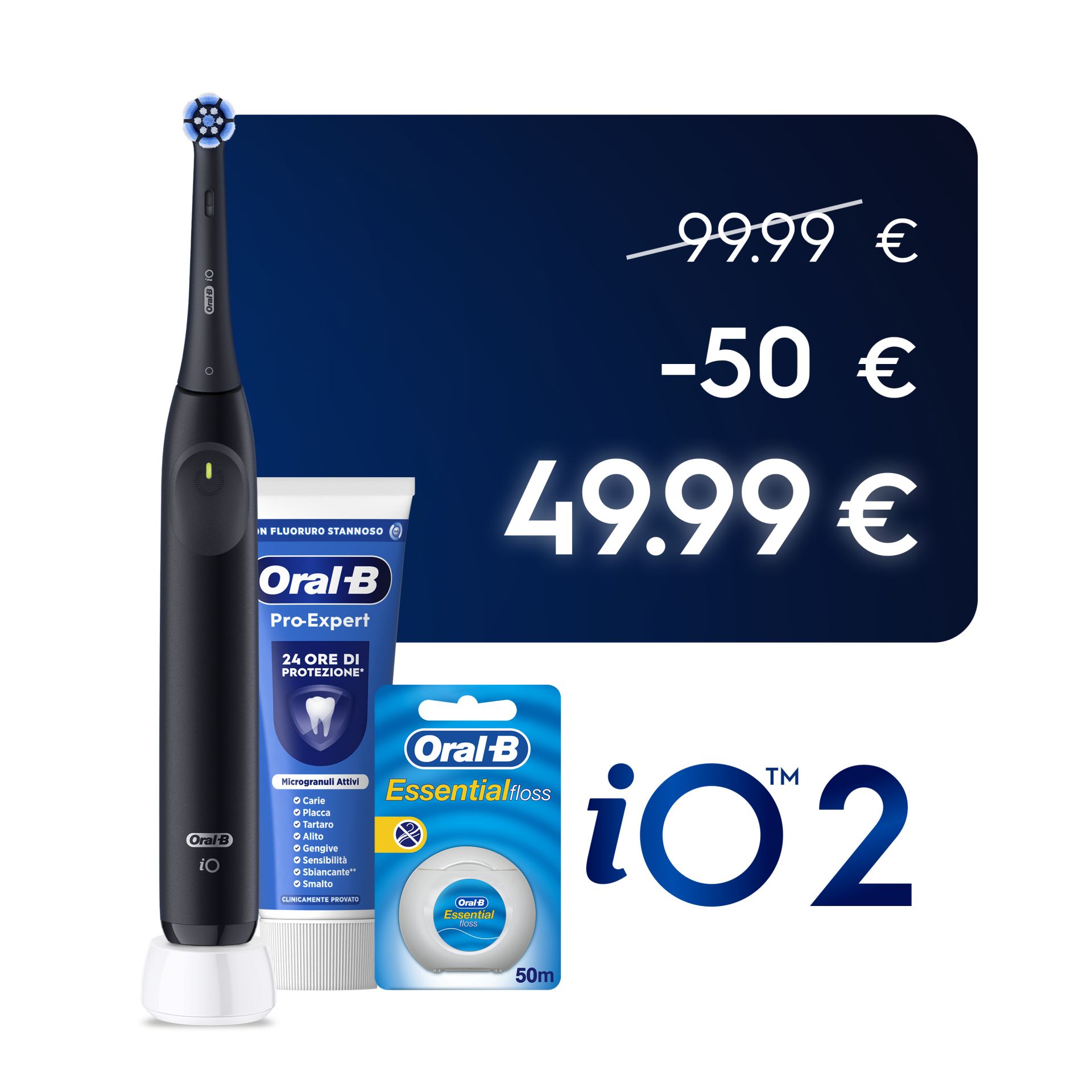 Oral-B Spazzolino Elettrico iO 2 Nero, 1 Testina, 1 Custodia Da Viaggio + Dentifricio Pro-Expert + Filo Interdentale Essential