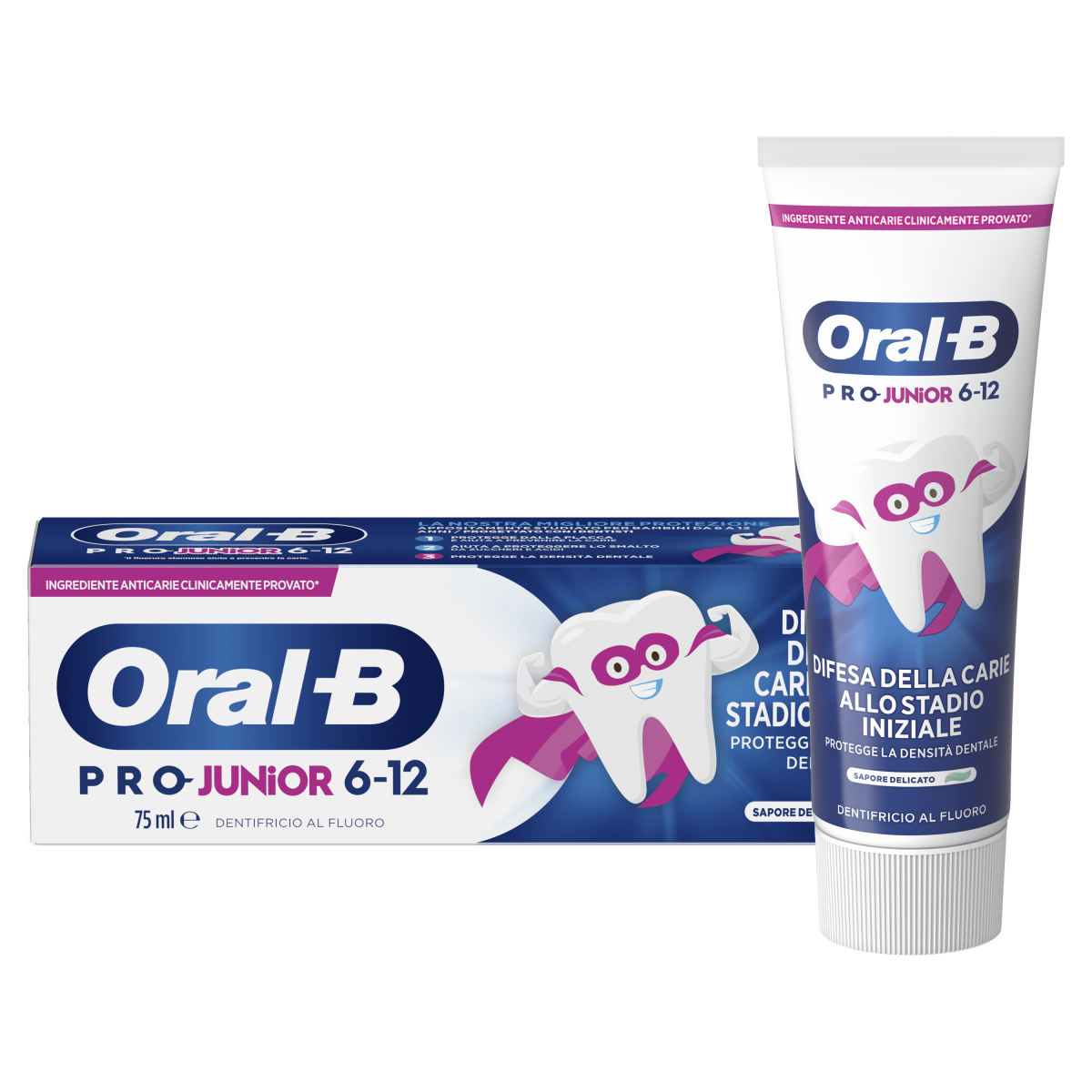 Oral-B Pro Junior è pensato per i bambini dai 6 anni in su. Disegnato in collaborazione con i dentisti, protegge i denti ogni giorno dagli acidi e dagli zuccheri contenuti nei cibi aiutando a prevenire la carie. Ha un delicato sapore di menta e un livello di fluoro adatto all’età, che aiuta a proteggere lo smalto.