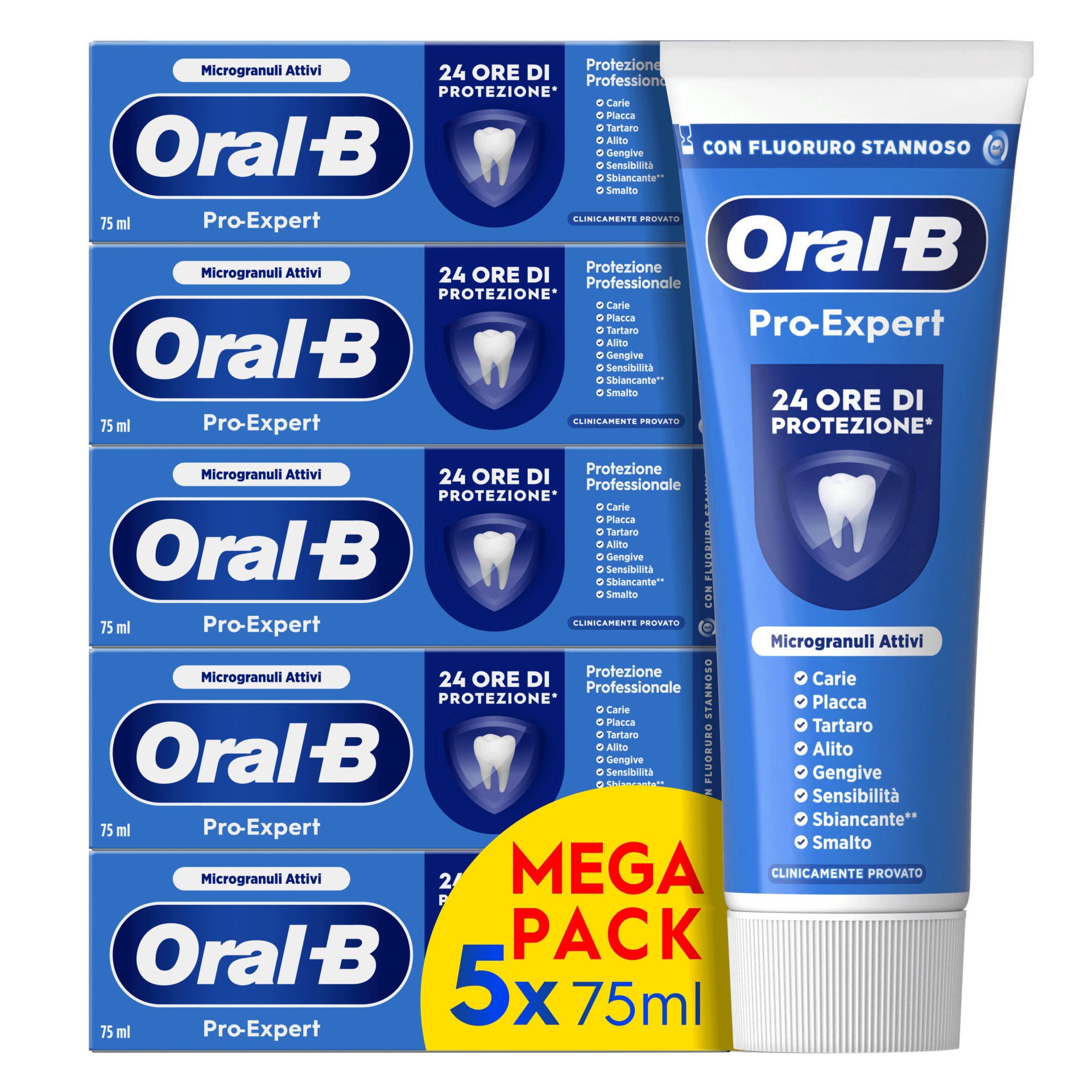 Il Dentifricio Oral-B Pro-Expert Protezione Professionale offre 24 ore di protezione se utilizzato due volte al giorno. L'esclusiva tecnologia Antibatterica con Complesso di Fluoruro Stannoso crea uno scudo protettivo che aiuta a ridurre la formazione della placca batterica anche dopo aver lavato i denti. Una combinazione di note fruttate e menta, con un leggero sapore speziato per una delicata sensazione di freschezza.