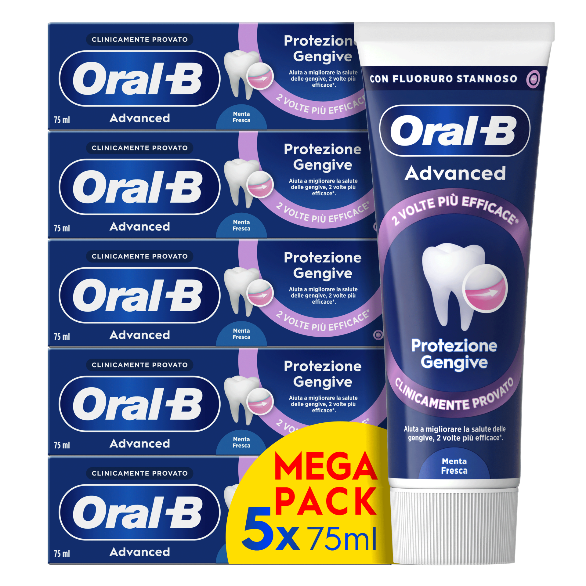 Il Dentifricio Oral-B Advanced Protezione Gengive aiuta a migliorare la salute delle gengive con un effetto due volte più efficace rispetto ad un dentifricio tradizionale al fluoro. L'esclusiva tecnologia Antibatterica con Complesso di Fluoruro Stannoso e Sale di Gluconato crea uno scudo protettivo per gengive sane e forti, combattendo la formazione della placca batterica anche dopo aver lavato i denti. Dentifricio per uso Quotidiano.