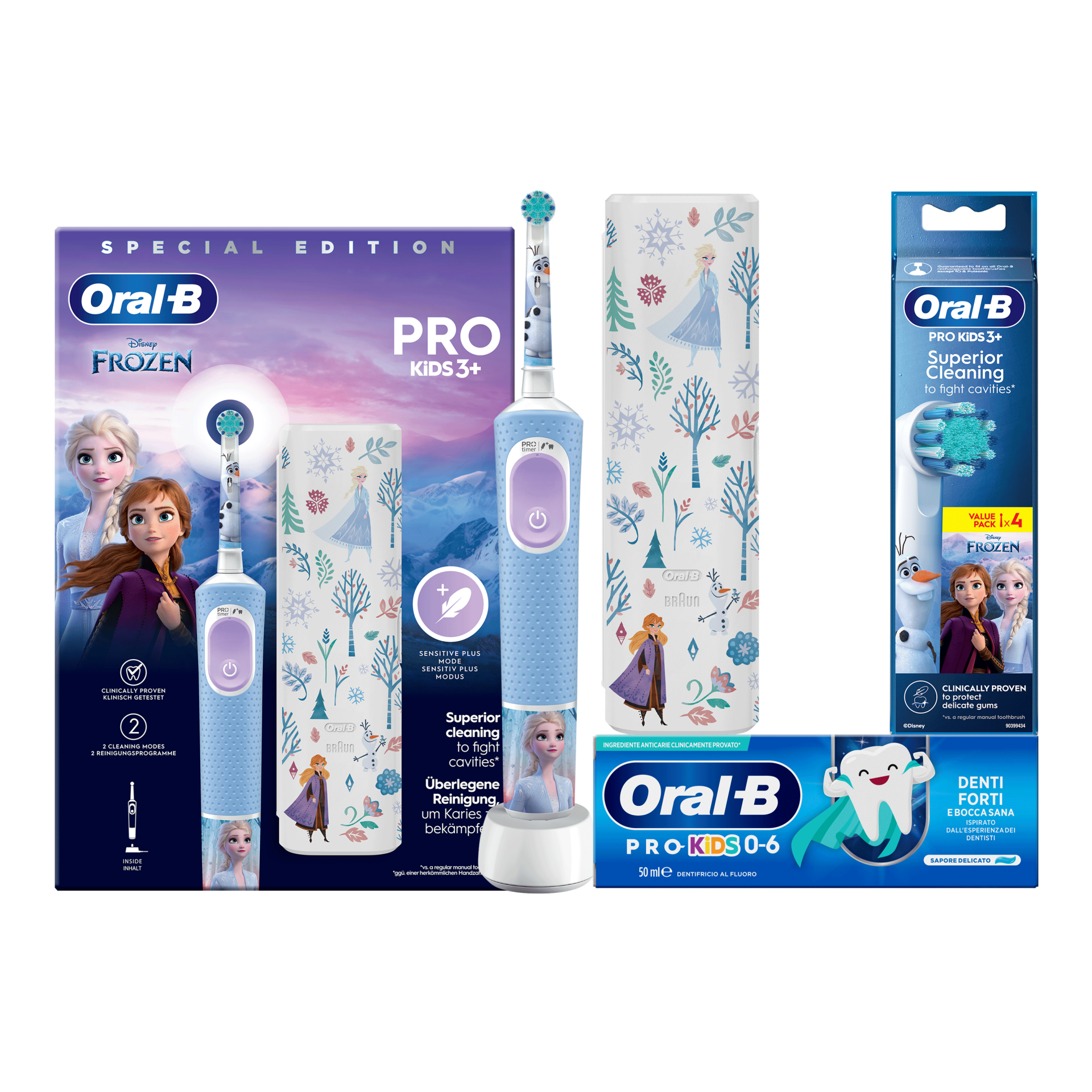 Lo spazzolino elettrico Oral-B Kids dai 3 anni in su offre ai bambini il divertimento di Disney Frozen con la pulizia efficace e delicata di uno spazzolino Oral-B raccomandato dai dentisti. Le setole extra morbide e la piccola testa rotonda sono state progettate appositamente per i bambini e sono compatibili con tutti gli spazzolini elettrici Oral-B Kids.