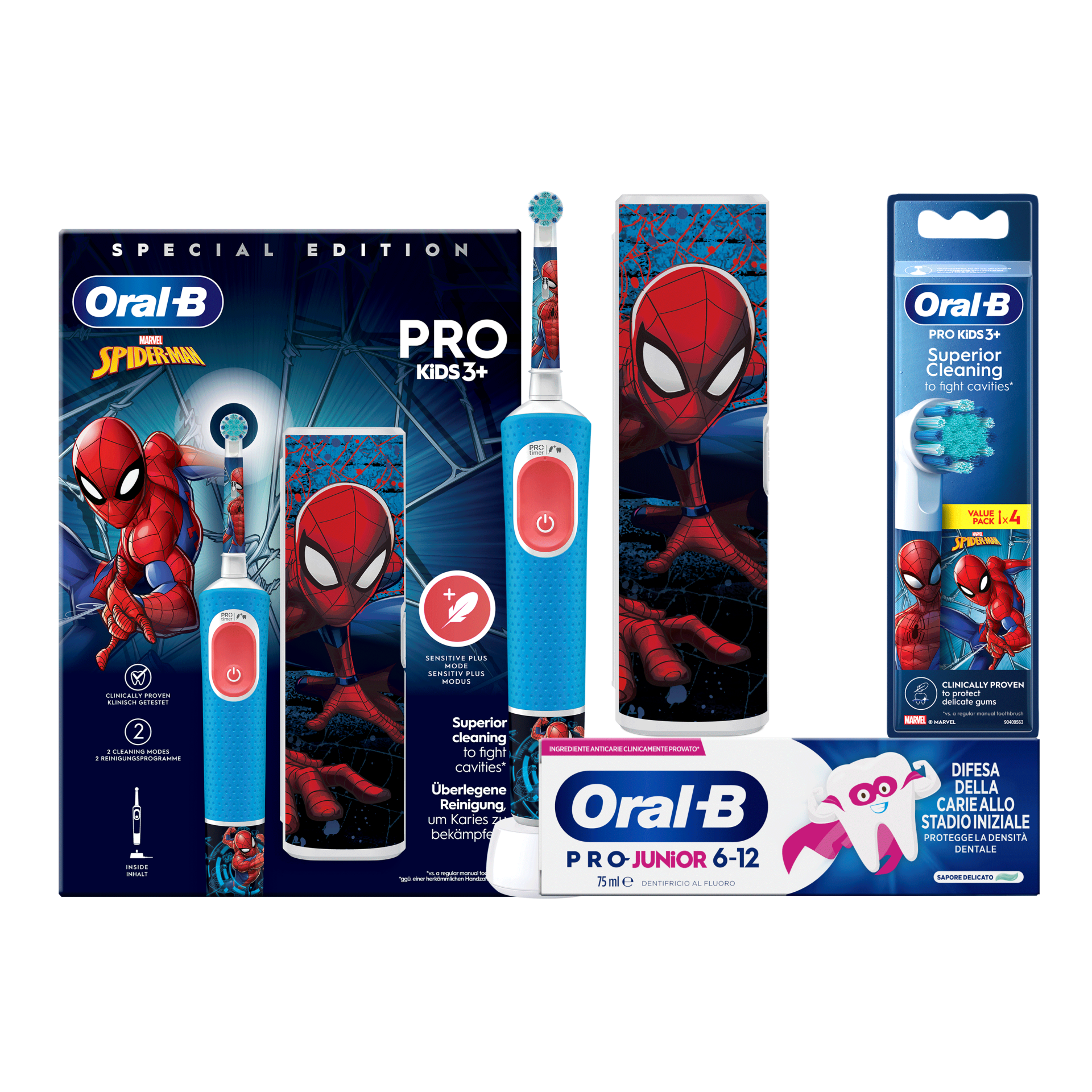 Lo spazzolino elettrico Oral-B Kids dai 3 anni in su offre ai bambini il divertimento di Spiderman con la pulizia efficace e delicata di uno spazzolino Oral-B raccomandato dai dentisti. Le setole extra morbide e la piccola testa rotonda sono state progettate appositamente per i bambini e sono compatibili con tutti gli spazzolini elettrici Oral-B Kids.