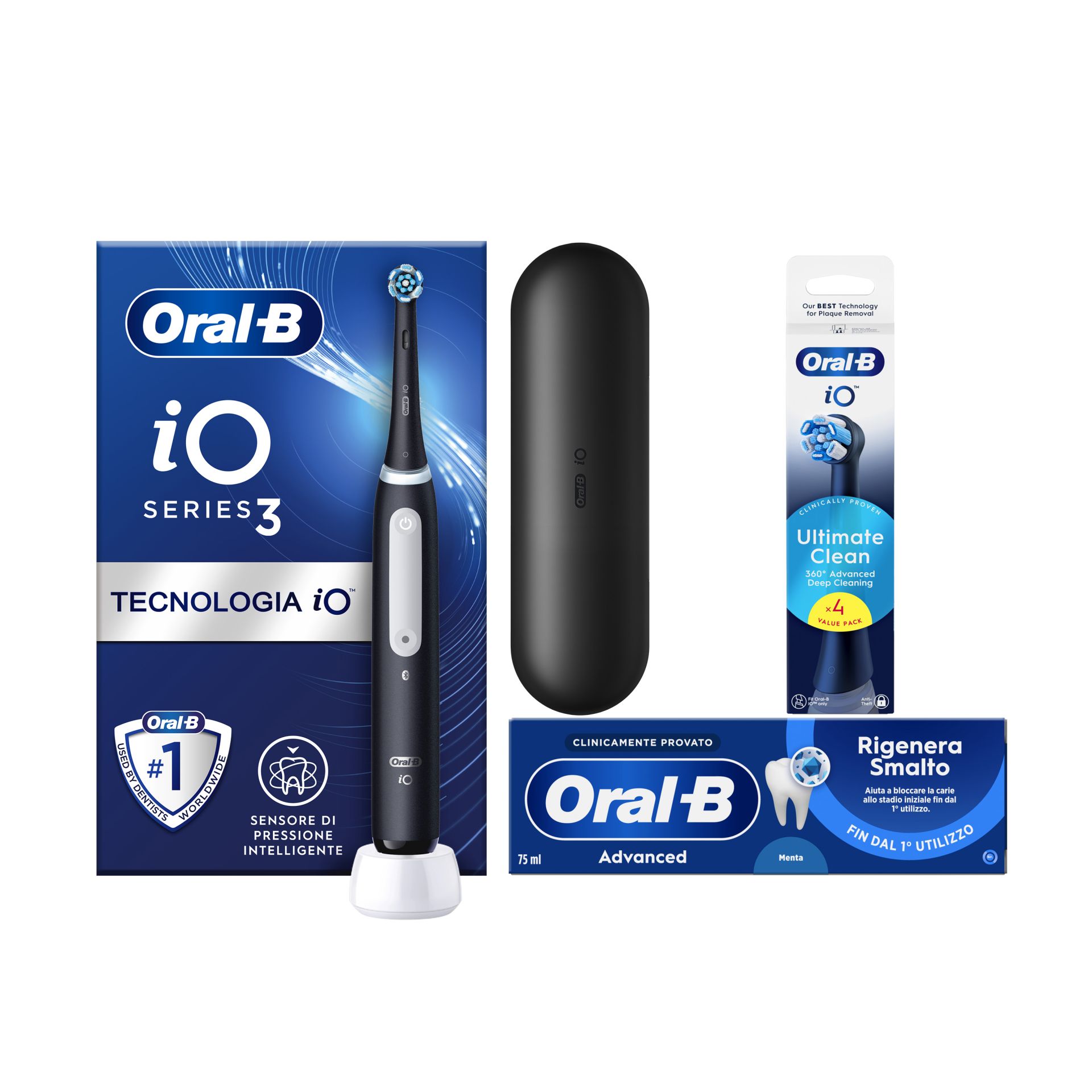 Lo spazzolino elettrico iO 3 presenta la migliore tecnologia Oral-B, combinando una testina rotonda ispirata agli strumenti dei dentisti con setole oscillanti per una sensazione di pulizia professionale ovunque tu sia. Il Sensore di Pressione intelligente ti aiuta a non spazzolare i denti troppo forte o troppo delicatamente per proteggere meglio le tue gengive. La funzione Protezione Gengive ti avvisa quando passi troppo tempo a spazzolare con troppa pressione. Sostituisci la testina dello spazzolino Oral-B iO ogni 3 mesi per risultati ottimali.
