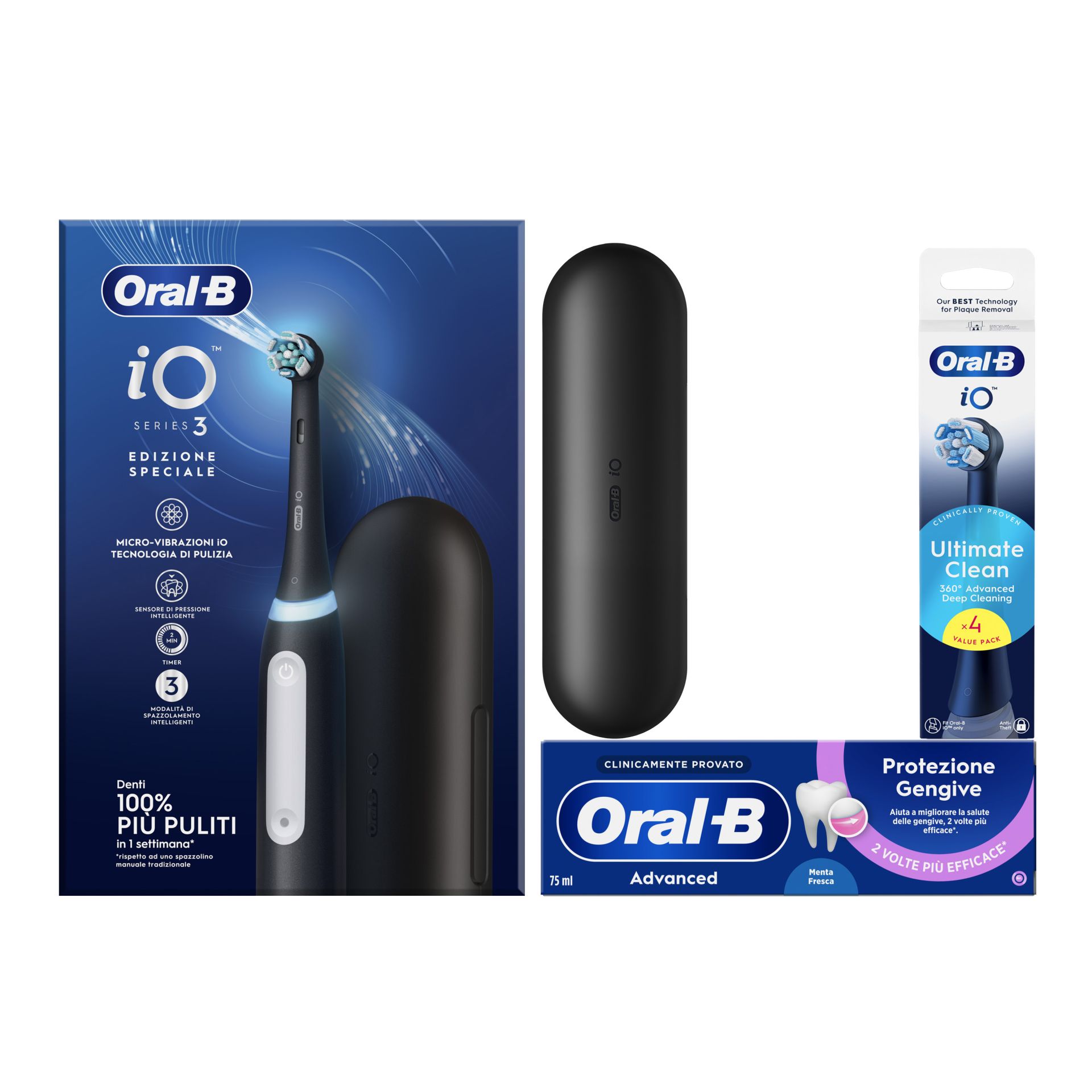 Lo spazzolino elettrico iO 3 presenta la migliore tecnologia Oral-B, combinando una testina rotonda ispirata agli strumenti dei dentisti con setole oscillanti per una sensazione di pulizia professionale ovunque tu sia. Il Sensore di Pressione intelligente ti aiuta a non spazzolare i denti troppo forte o troppo delicatamente per proteggere meglio le tue gengive. La funzione Protezione Gengive ti avvisa quando passi troppo tempo a spazzolare con troppa pressione. Sostituisci la testina dello spazzolino Oral-B iO ogni 3 mesi per risultati ottimali.