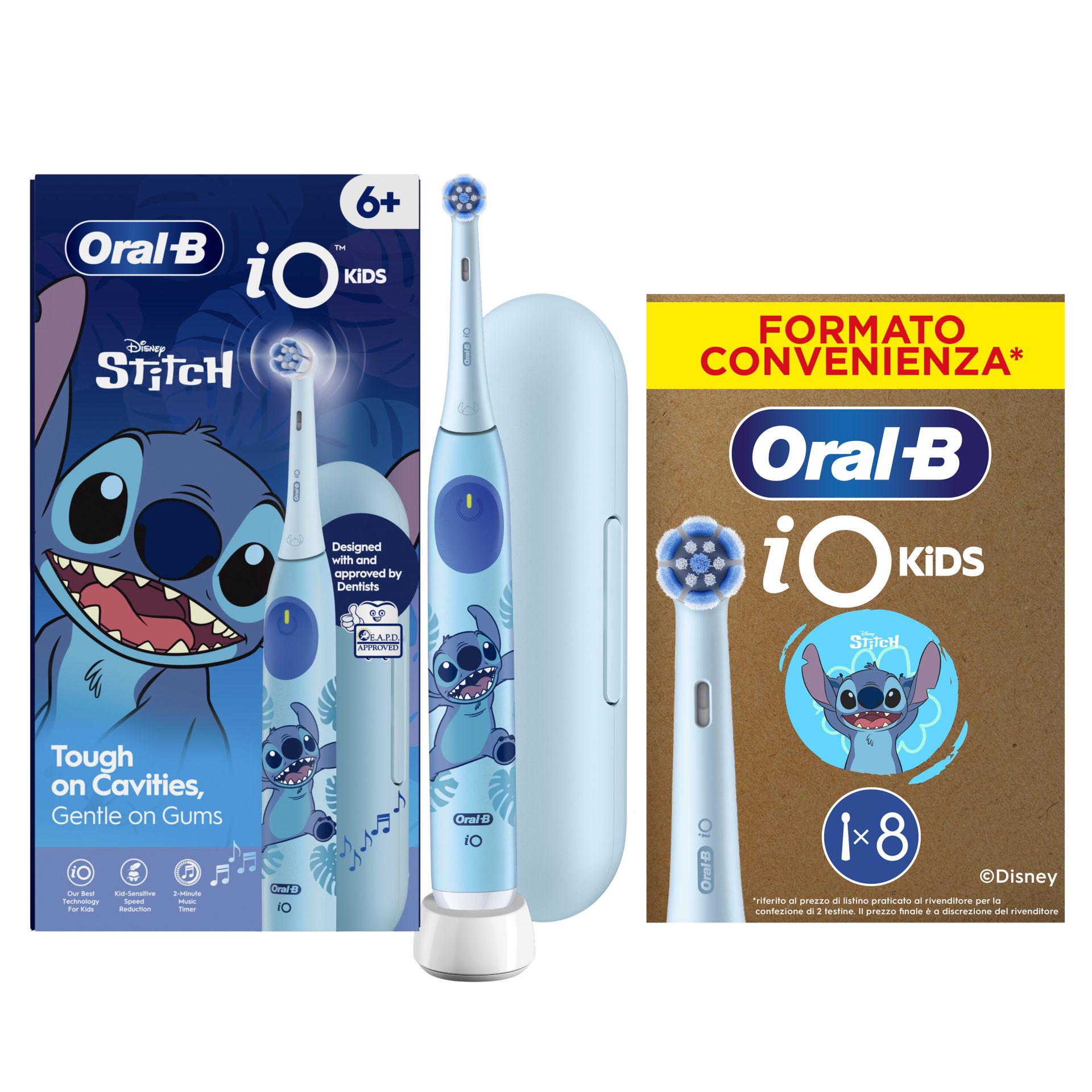 Lo spazzolino elettrico Oral-B iO Kids 6+ offre ai bambini il divertimento con Stitch insieme alla pulizia delicata ed efficace di uno spazzolino Oral-B progettato con e approvato dai dentisti. iO è la migliore tecnologia per bambini di Oral-B. L'esclusiva testina piccola e rotonda è progettata specificamente per i bambini, con setole extra morbide efficaci contro la carie e delicate su gengive e denti da latte.
