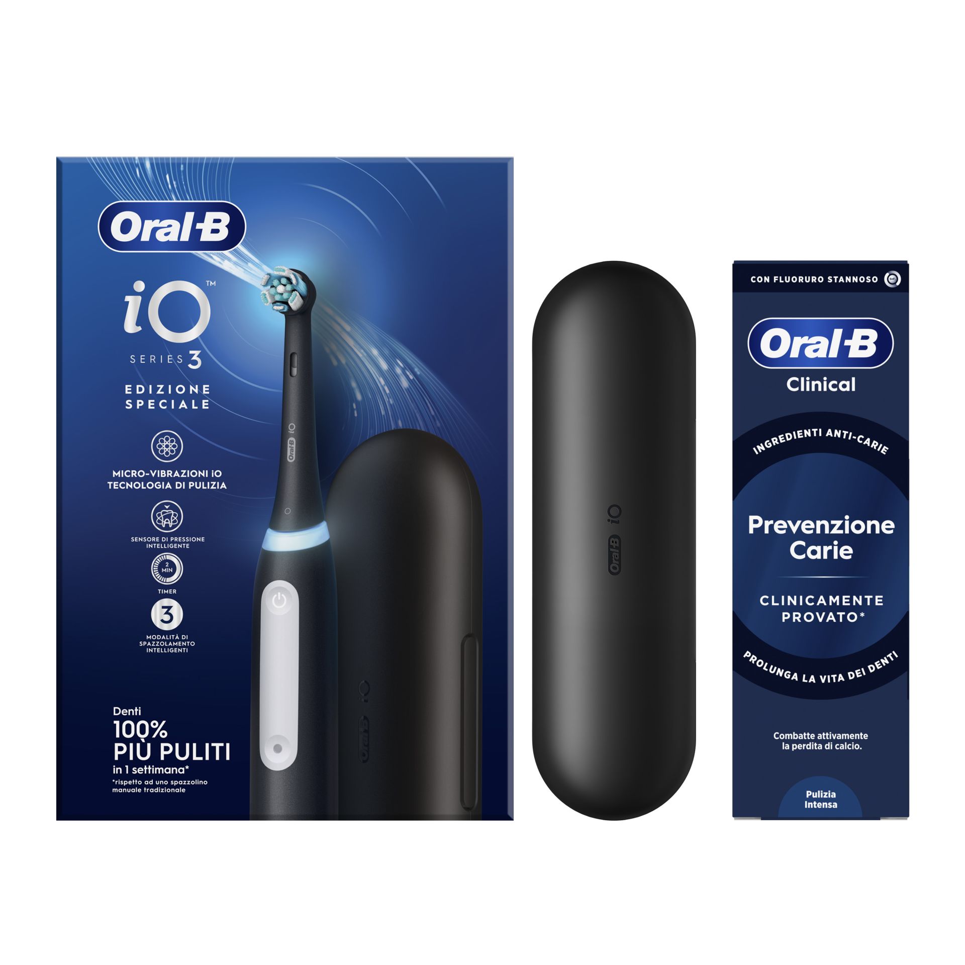 Lo spazzolino elettrico iO 3 presenta la migliore tecnologia Oral-B, combinando una testina rotonda ispirata agli strumenti dei dentisti con setole oscillanti per una sensazione di pulizia professionale ovunque tu sia. Il Sensore di Pressione intelligente ti aiuta a non spazzolare i denti troppo forte o troppo delicatamente per proteggere meglio le tue gengive. La funzione Protezione Gengive ti avvisa quando passi troppo tempo a spazzolare con troppa pressione. Sostituisci la testina dello spazzolino Oral-B iO ogni 3 mesi per risultati ottimali.