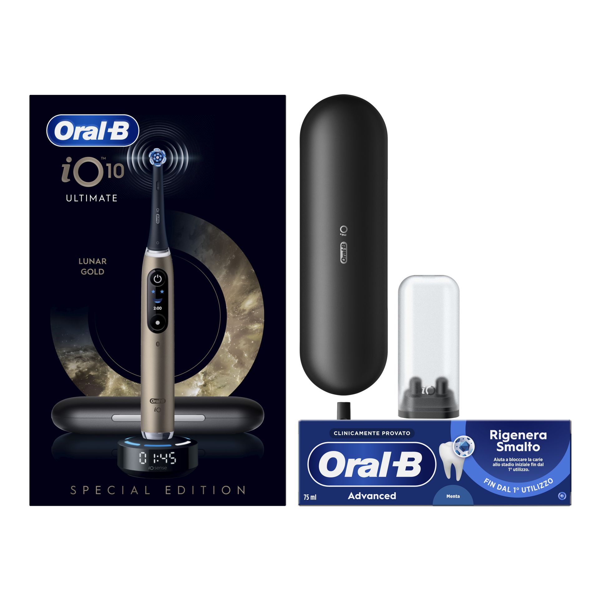 Lo spazzolino elettrico iO10 con il rivoluzionario caricatore smart iO Sense personalizza la tua igiene orale con un feedback in tempo reale, guidandoti per una pulizia perfetta. Display interattivo con timer e sensore di pressione sulle gengive per una pulizia straordinariamente semplice. Combina delicate micro-vibrazioni con l'esclusiva testina rotonda ispirata agli strumenti dei dentisti per una sensazione di pulizia professionale ogni giorno. Caricatore magnetico per una ricarica rapida in sole 3 ore. Sostituisci la testina dello spazzolino Oral-B iO ogni 3 mesi per una pulizia più efficace.