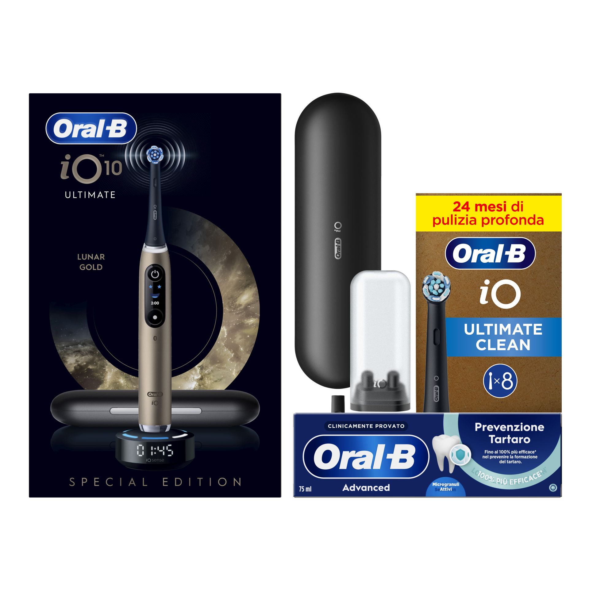 Oral-B Spazzolino Elettrico iO 10 Gold Special Edition, 1 Testina, 1 Custodia Da Viaggio + Dentifricio Advanced Prevenzione Tartaro + Testine di Ricambio iO Ultimate Clean Nere, Confezione da 8 Testine