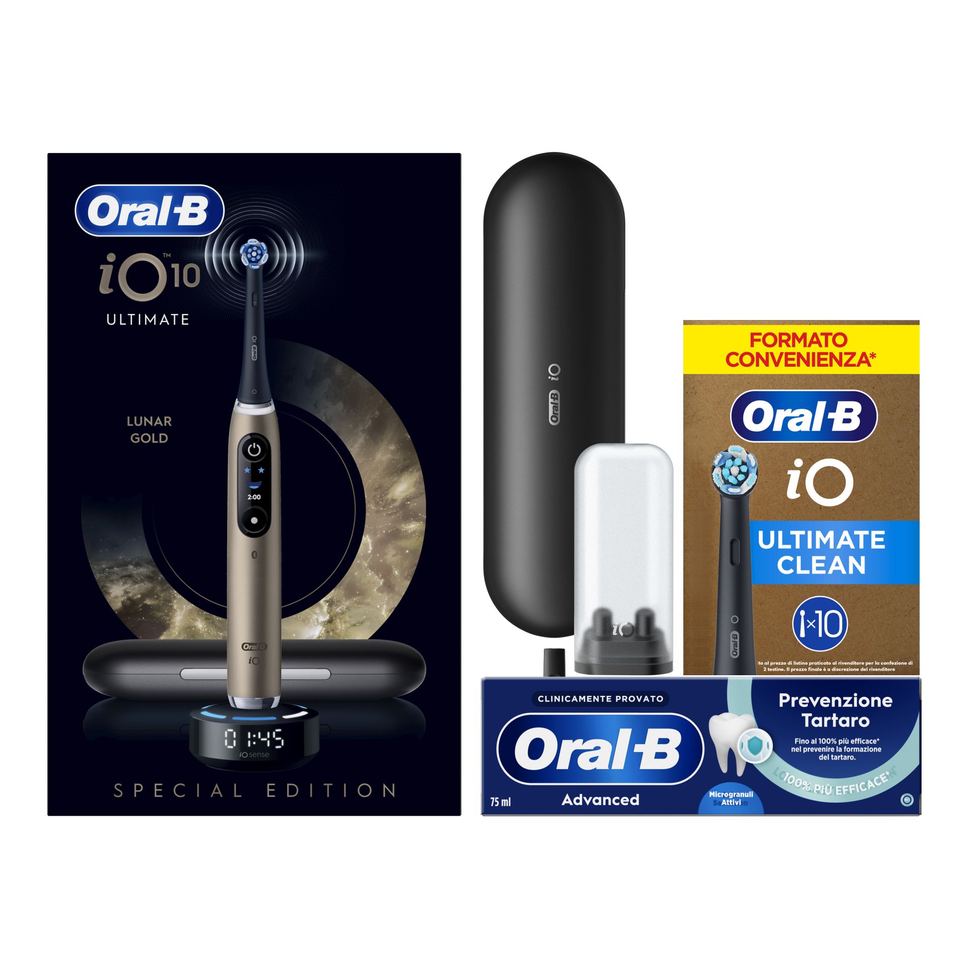 Lo spazzolino elettrico iO10 con il rivoluzionario caricatore smart iO Sense personalizza la tua igiene orale con un feedback in tempo reale, guidandoti per una pulizia perfetta. Display interattivo con timer e sensore di pressione sulle gengive per una pulizia straordinariamente semplice. Combina delicate micro-vibrazioni con l'esclusiva testina rotonda ispirata agli strumenti dei dentisti per una sensazione di pulizia professionale ogni giorno. Caricatore magnetico per una ricarica rapida in sole 3 ore. Sostituisci la testina dello spazzolino Oral-B iO ogni 3 mesi per una pulizia più efficace.