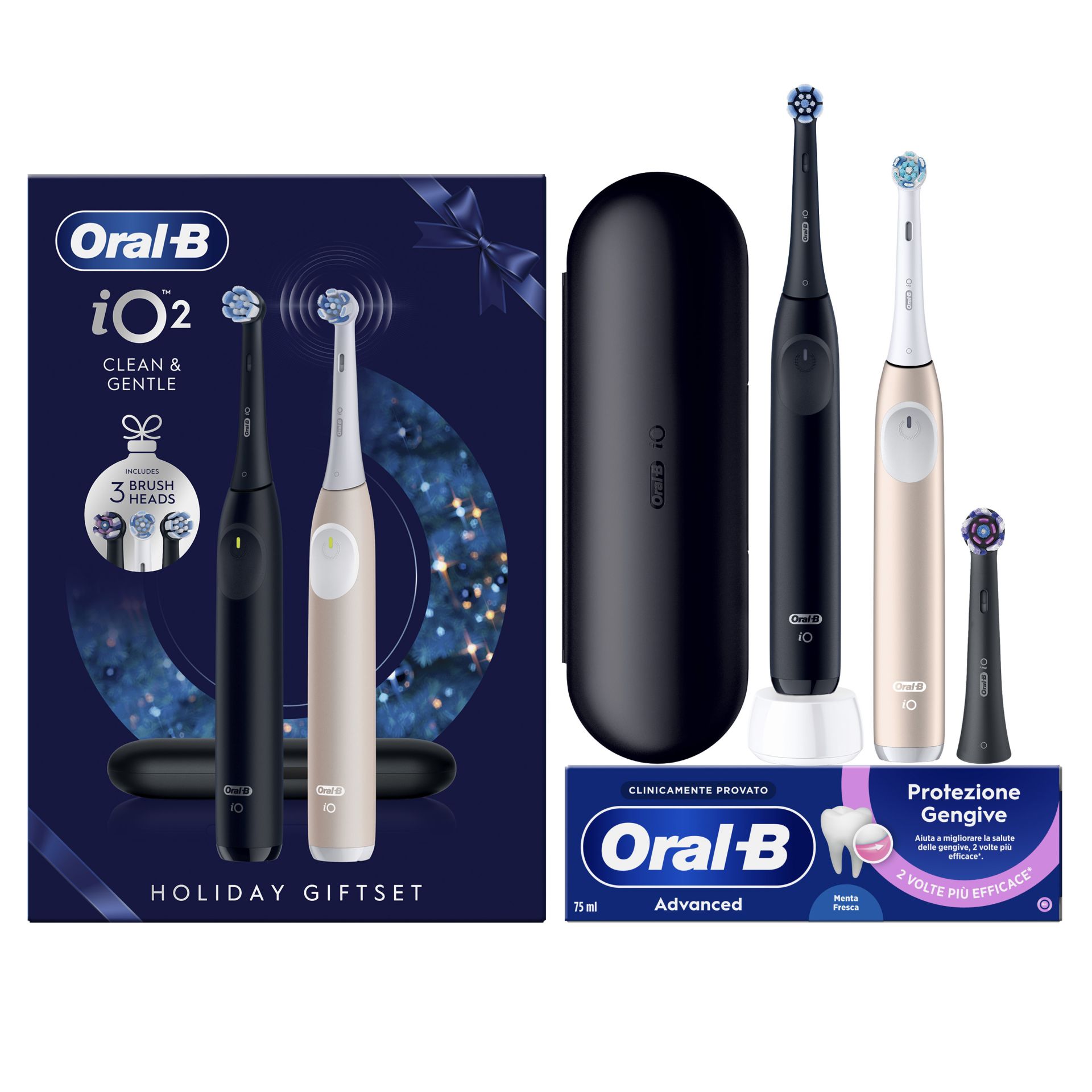 Contenuto: 2 SPAZZOLINI ELETTRICI, 3 TESTINE, 1 CUSTODIA DA VIAGGIO, 1 CARICATORE