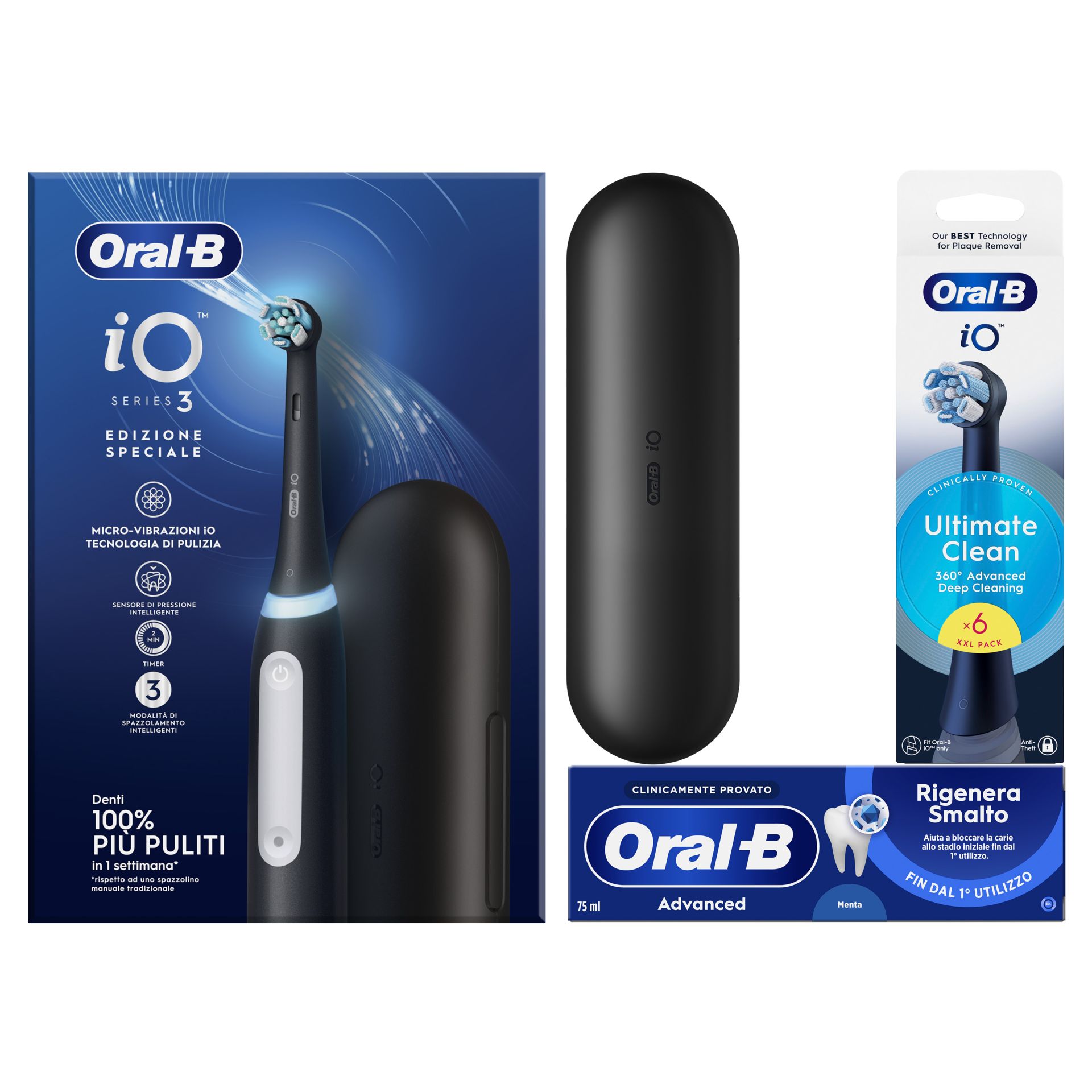 Lo spazzolino elettrico iO 3 presenta la migliore tecnologia Oral-B, combinando una testina rotonda ispirata agli strumenti dei dentisti con setole oscillanti per una sensazione di pulizia professionale ovunque tu sia. Il Sensore di Pressione intelligente ti aiuta a non spazzolare i denti troppo forte o troppo delicatamente per proteggere meglio le tue gengive. La funzione Protezione Gengive ti avvisa quando passi troppo tempo a spazzolare con troppa pressione. Sostituisci la testina dello spazzolino Oral-B iO ogni 3 mesi per risultati ottimali.
