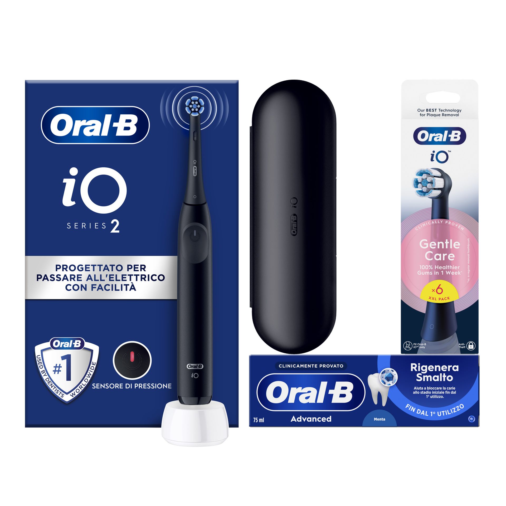 Oral-B Spazzolino Elettrico iO 2 Nero, 1 Testina + 6 di Ricambio, 1 Custodia Da Viaggio + Dentifricio Advanced Rigenera Smalto