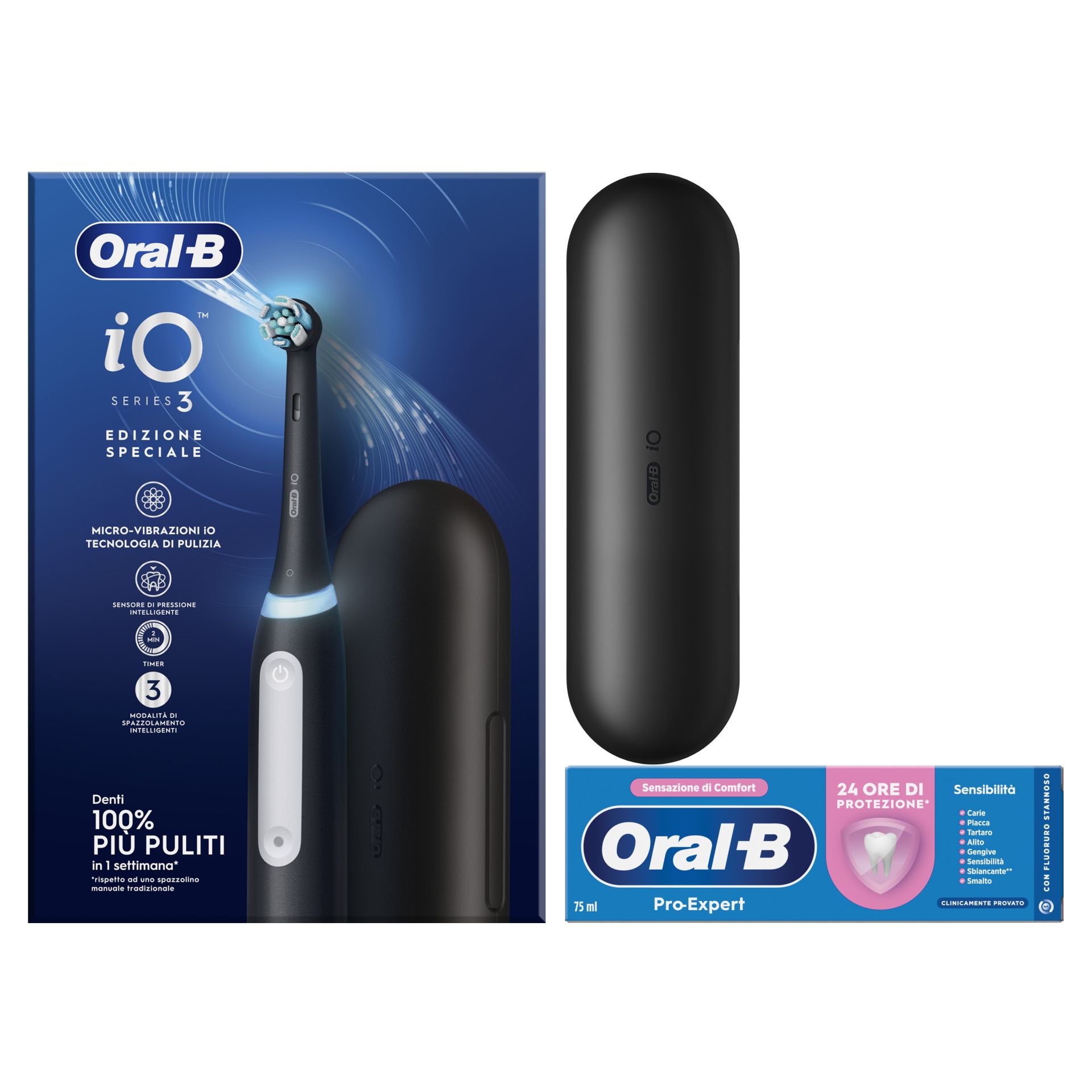Lo spazzolino elettrico iO 3 presenta la migliore tecnologia Oral-B, combinando una testina rotonda ispirata agli strumenti dei dentisti con setole oscillanti per una sensazione di pulizia professionale ovunque tu sia. Il Sensore di Pressione intelligente ti aiuta a non spazzolare i denti troppo forte o troppo delicatamente per proteggere meglio le tue gengive. La funzione Protezione Gengive ti avvisa quando passi troppo tempo a spazzolare con troppa pressione. Sostituisci la testina dello spazzolino Oral-B iO ogni 3 mesi per risultati ottimali.