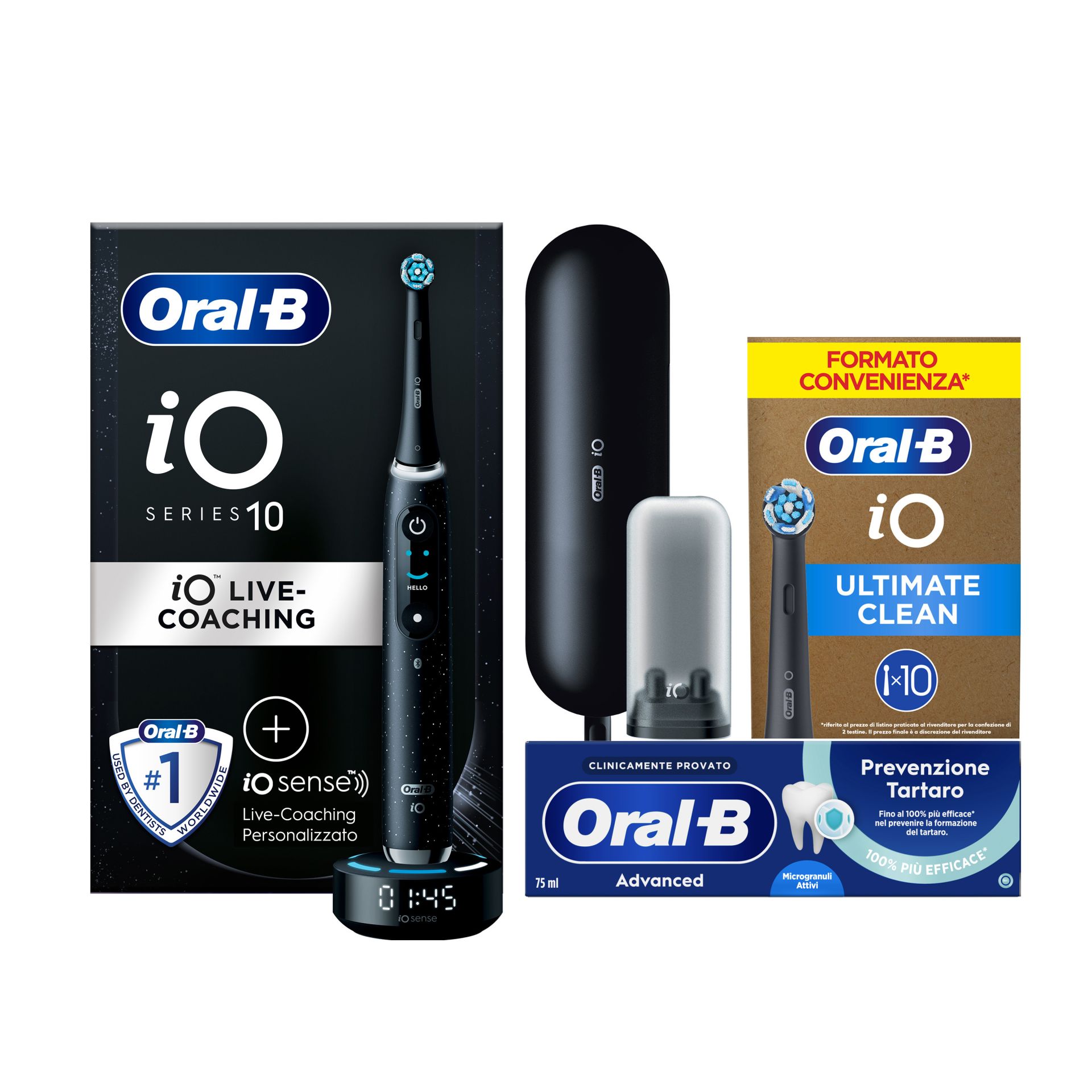 Lo spazzolino elettrico iO 10 con il suo rivoluzionario caricatore intelligente iO Sense personalizza il tuo spazzolamento, ti guida in tempo reale per una perfetta applicazione, la giusta durata e la corretta pressione di spazzolamento. Combina micro-vibrazioni delicate con una testina rotonda ispirata a quella degli strumenti dei dentisti per una sensazione di pulizia professionale ogni giorno. Sostituisci la testina dello spazzolino Oral-B iO ogni 3 mesi per una pulizia efficace al 100%.