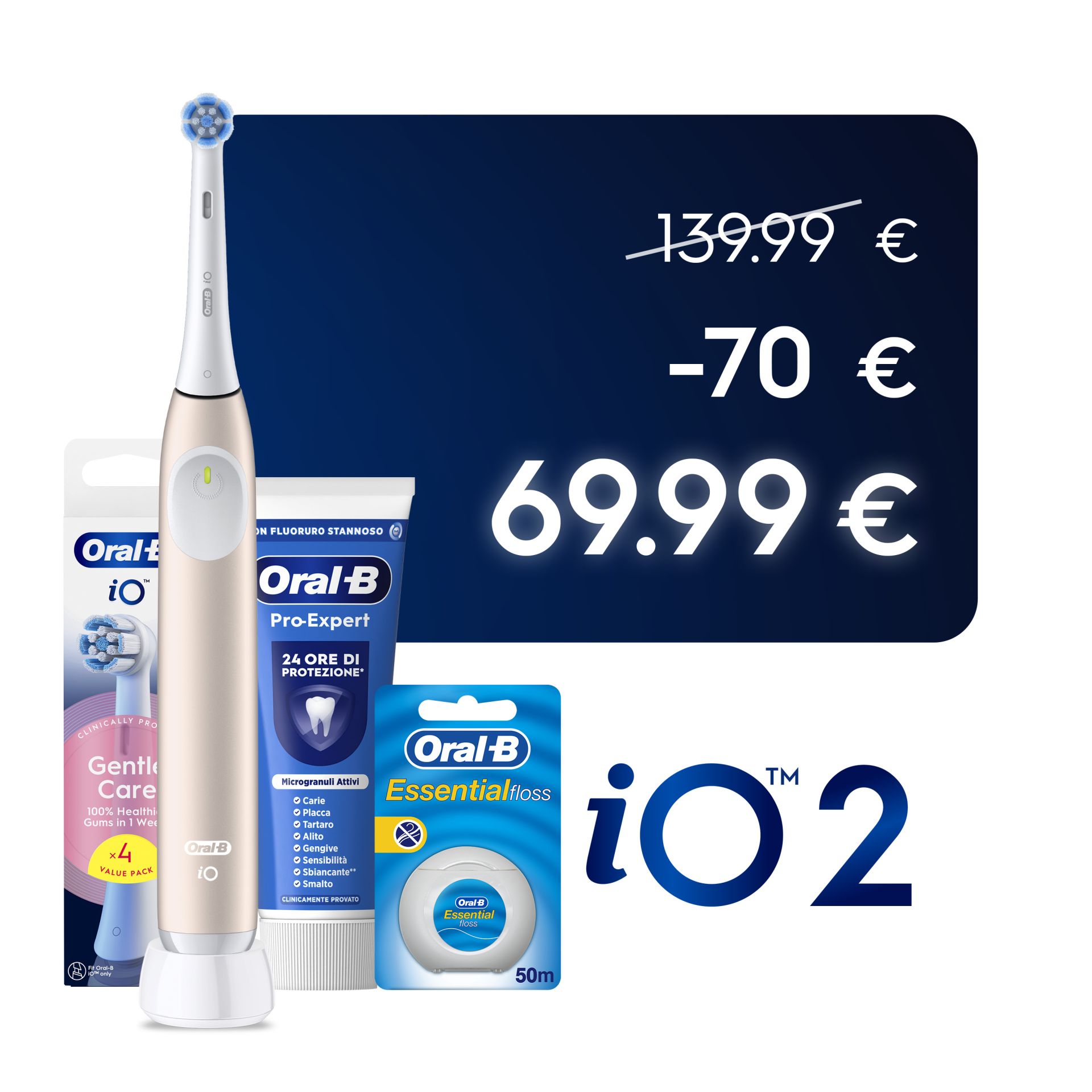 Oral-B Spazzolino Elettrico iO 2 Rosa, 1 Testina, 1 Custodia Da Viaggio + 4 Testine iO Gentle Care Bianche + Dentifricio Pro-Expert + Filo Interdentale Essential